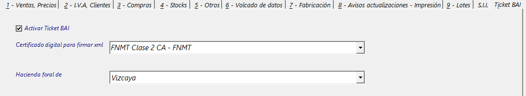 Para configurar Ticket Bai en Ambar7, debemos acceder a la personalización general, y en la pestaña “Ticket Bai”, seleccionar el certificado digital a usar y en cuál de las haciendas forales vamos a declarar.