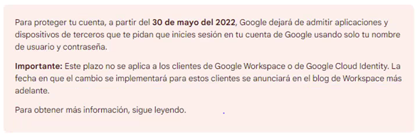 El pasado 30 de mayo de 2022 Google ha cambiado la política de seguridad en sus cuentas de correo de gmail. Es decir, a partir de ahora para usar el correo en aplicaciones de terceros es necesario habilitar la autenticación en dos pasos además de habilitar las contraseñas de aplicaciones.